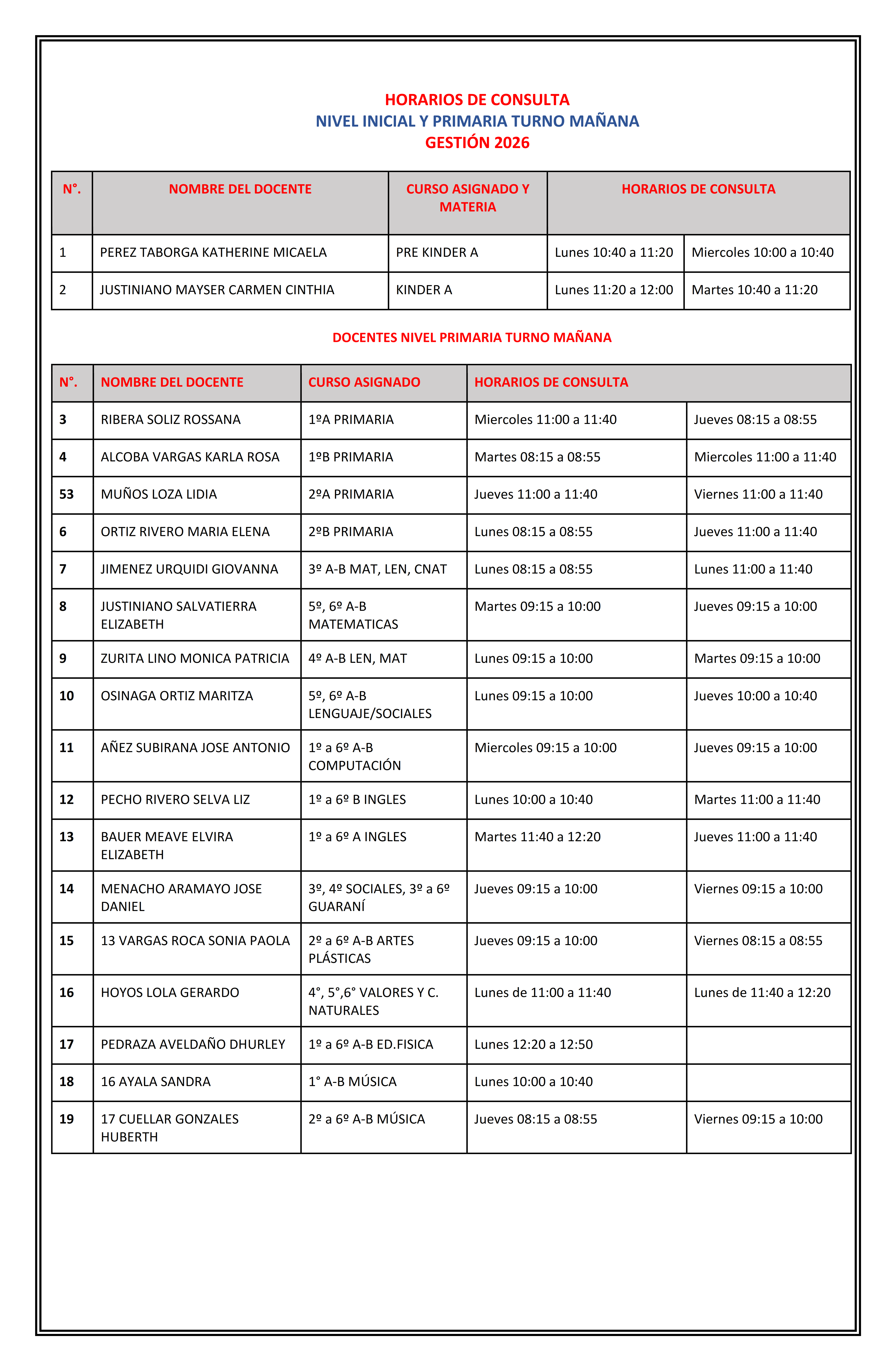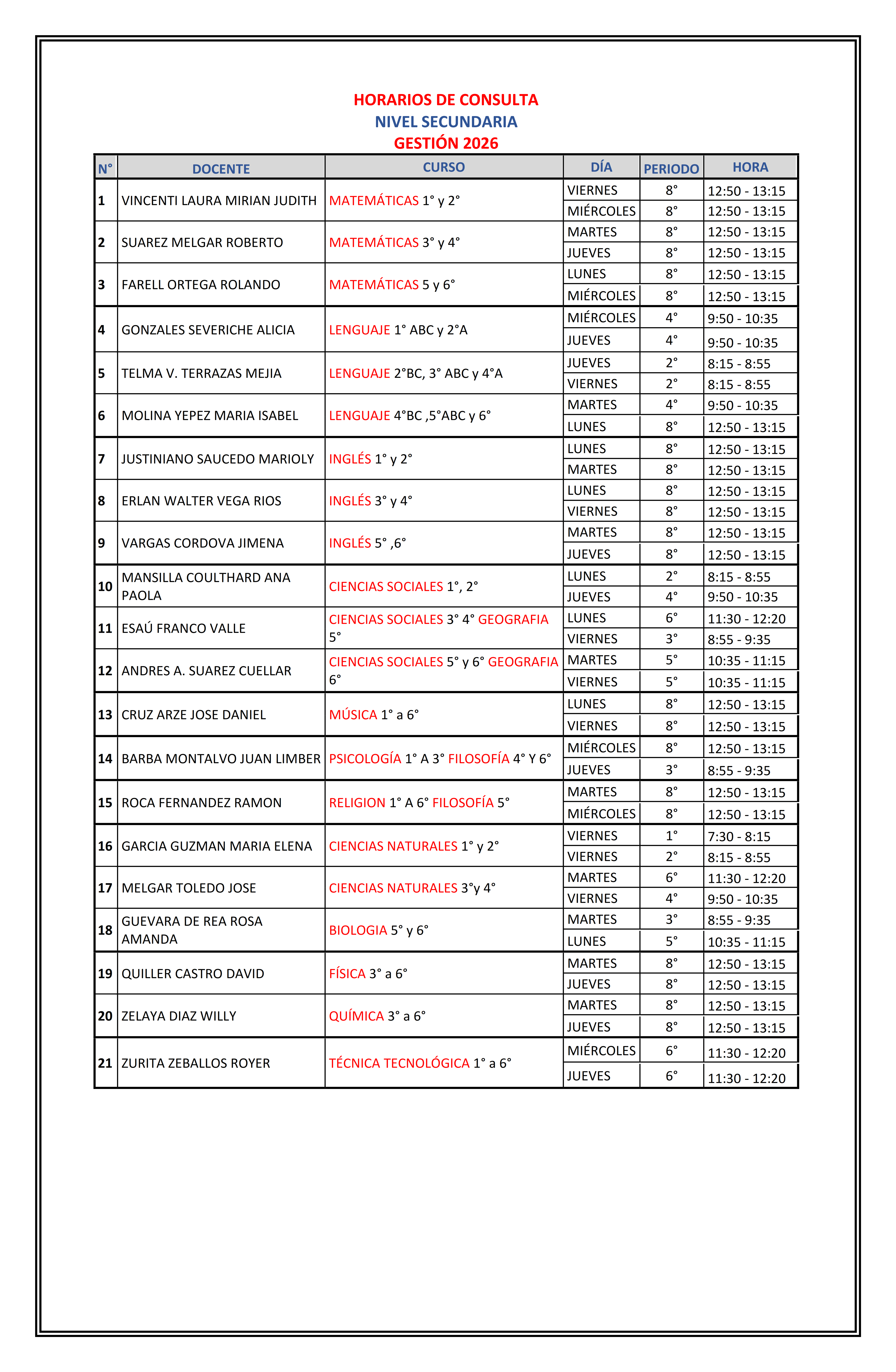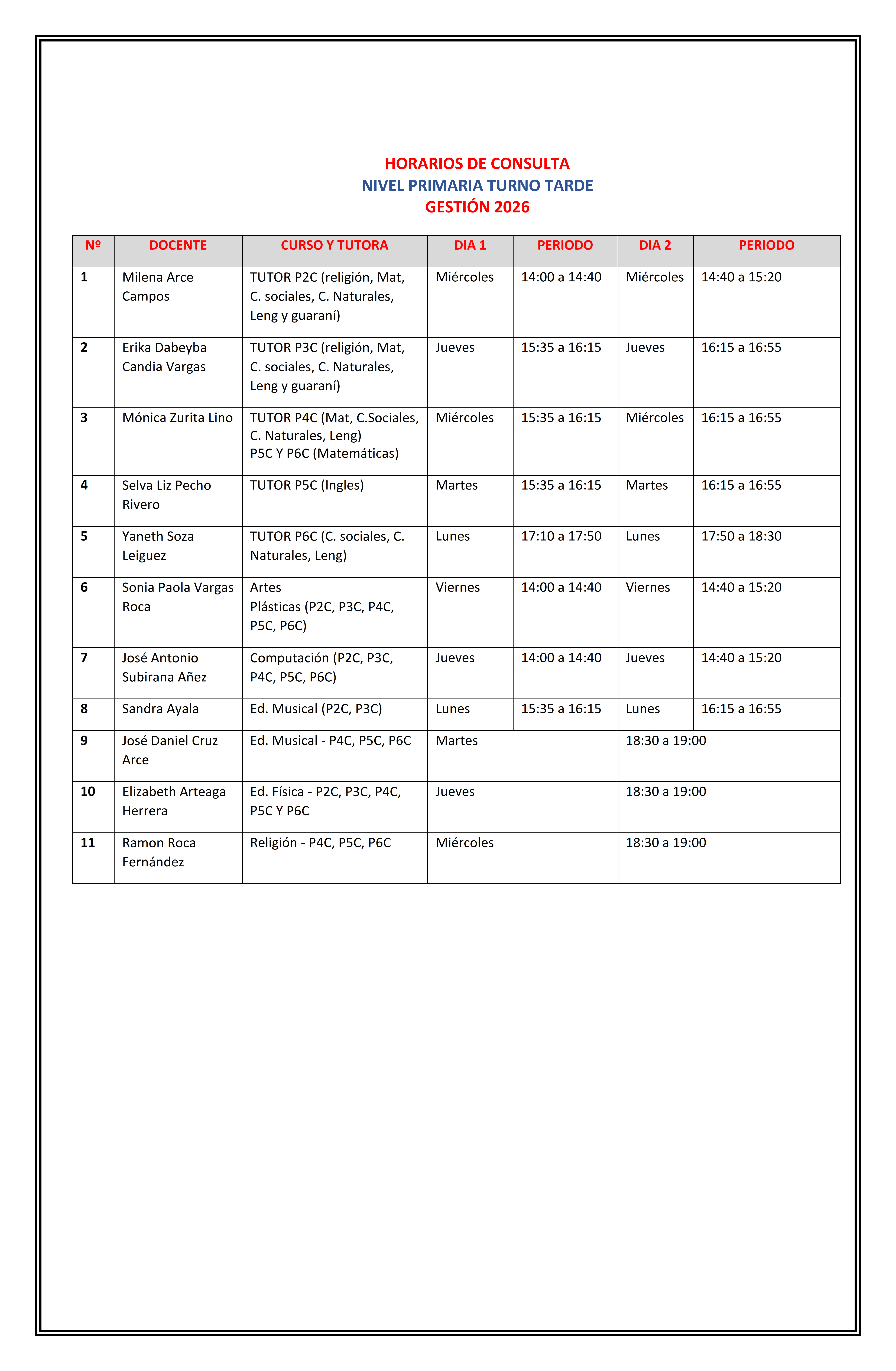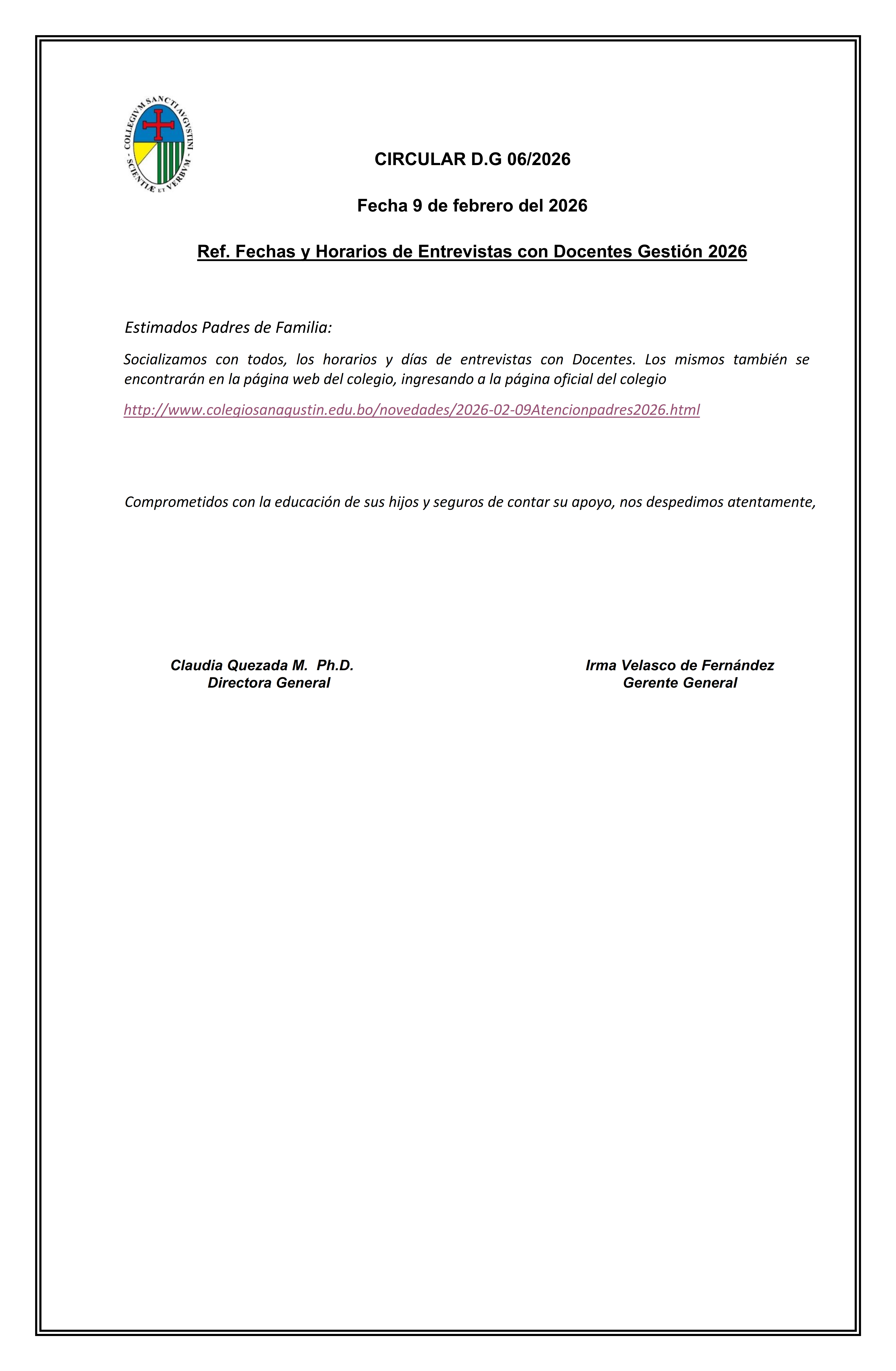 CIRCULAR D.G. 06/2026 Ref. Fechas y Horarios de Entrevistas con Docentes Gestión 2026 Mar 12, 2026 by admincsaCategories: Uncategorized CIRCULAR D.G. 06/2026 Ref. Fechas y Horarios de Entrevistas con Docentes Gestión 2026 Share: Previous Article CIRCULAR D.G. 05/2026 Ref. Recordando las Normas de nuestro Colegio Next Article CIRCULAR D.G. 07/2026 Ref. Feriado de Carnaval