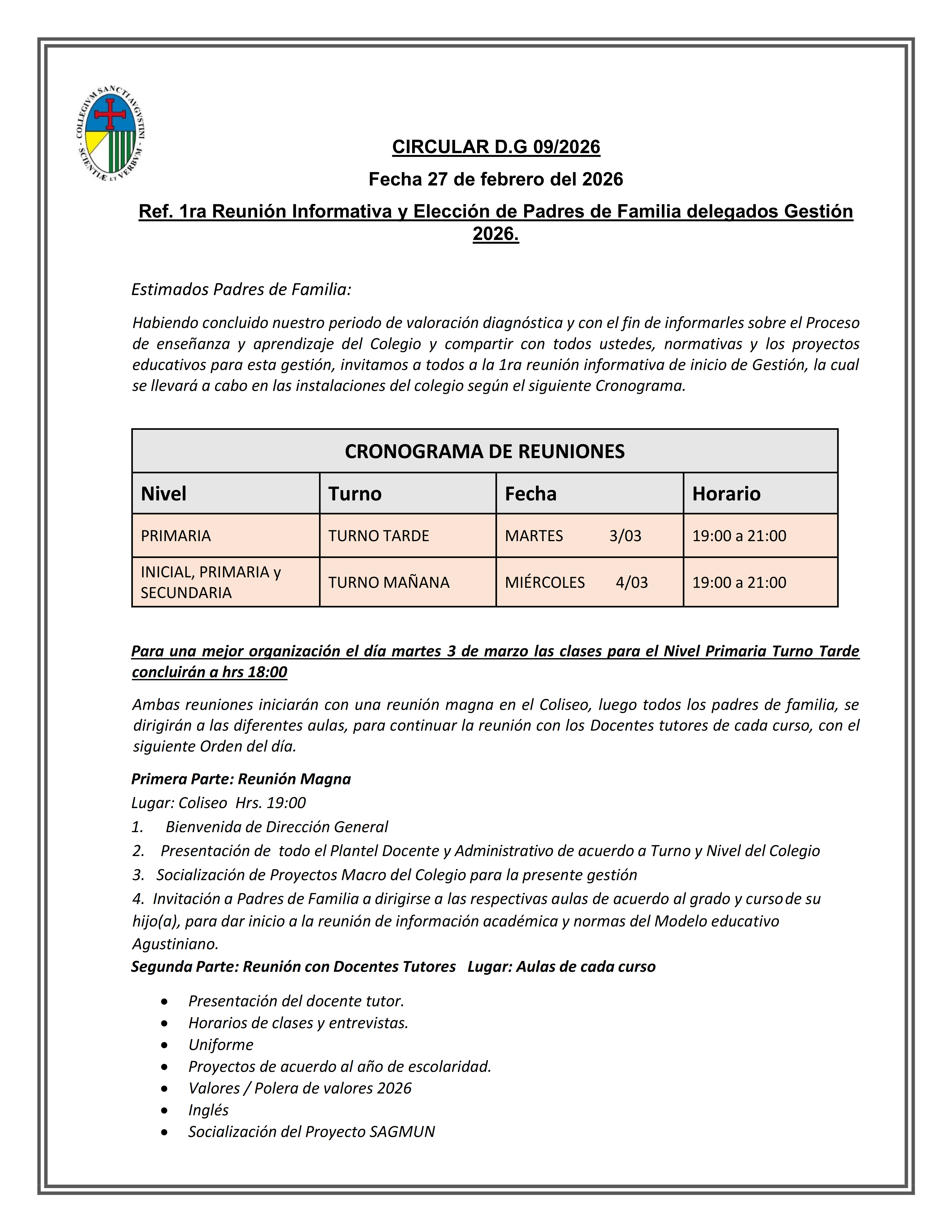 CIRCULAR D.G. 09/2026 Ref. 1ra Reunión Informativa y Elección de Padres de Familia delegados Gestión2026. Mar 12, 2026 by admincsaCategories: Uncategorized CIRCULAR D.G. 09/2026 Ref. 1ra Reunión Informativa y Elección de Padres de Familia delegados Gestión 2026. Share: Previous Article CIRCULAR D.G. 08/2026 Ref. Solicitud de Licencias Next Article CIRCULAR D.G. 10/2026 Ref. Campaña de Vacunación contra el Sarampión