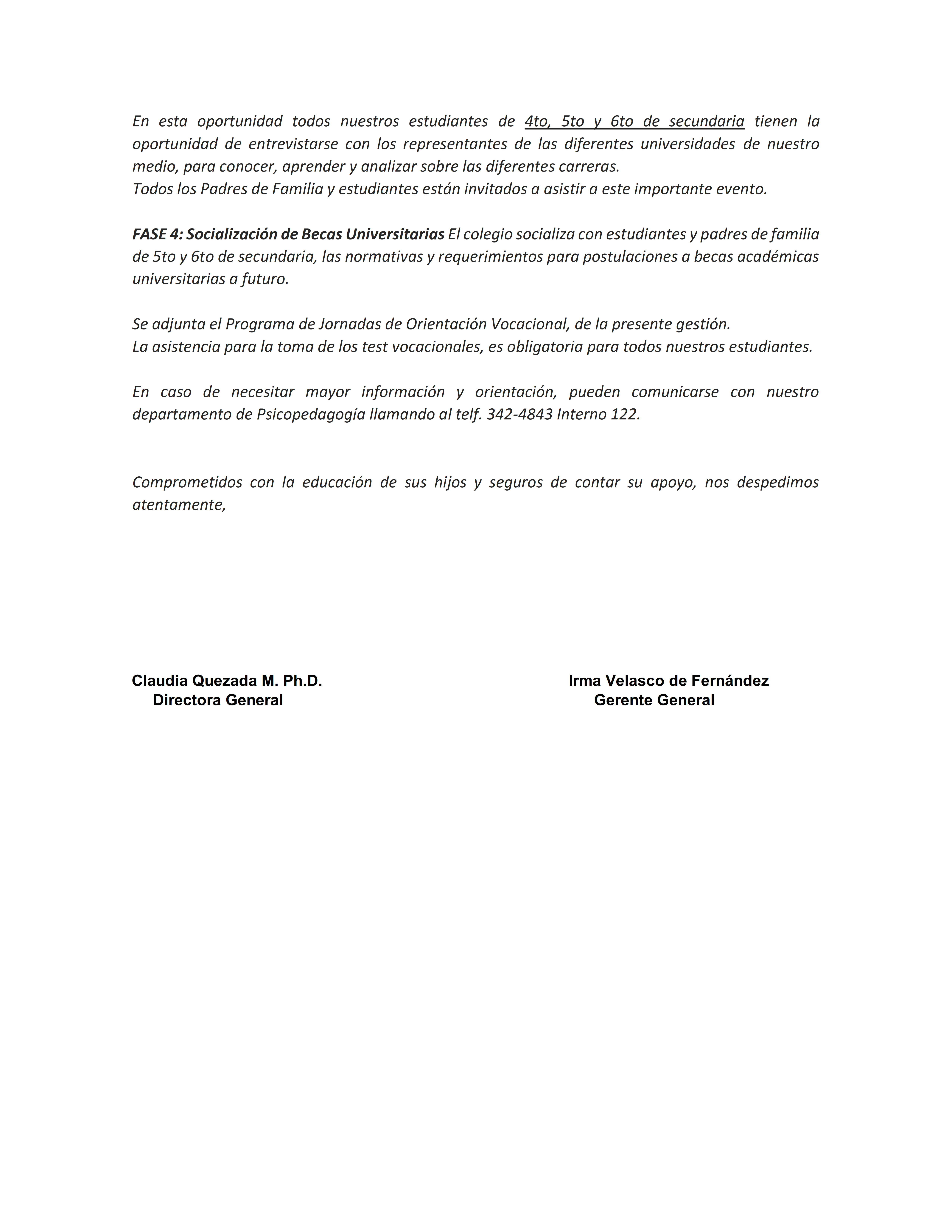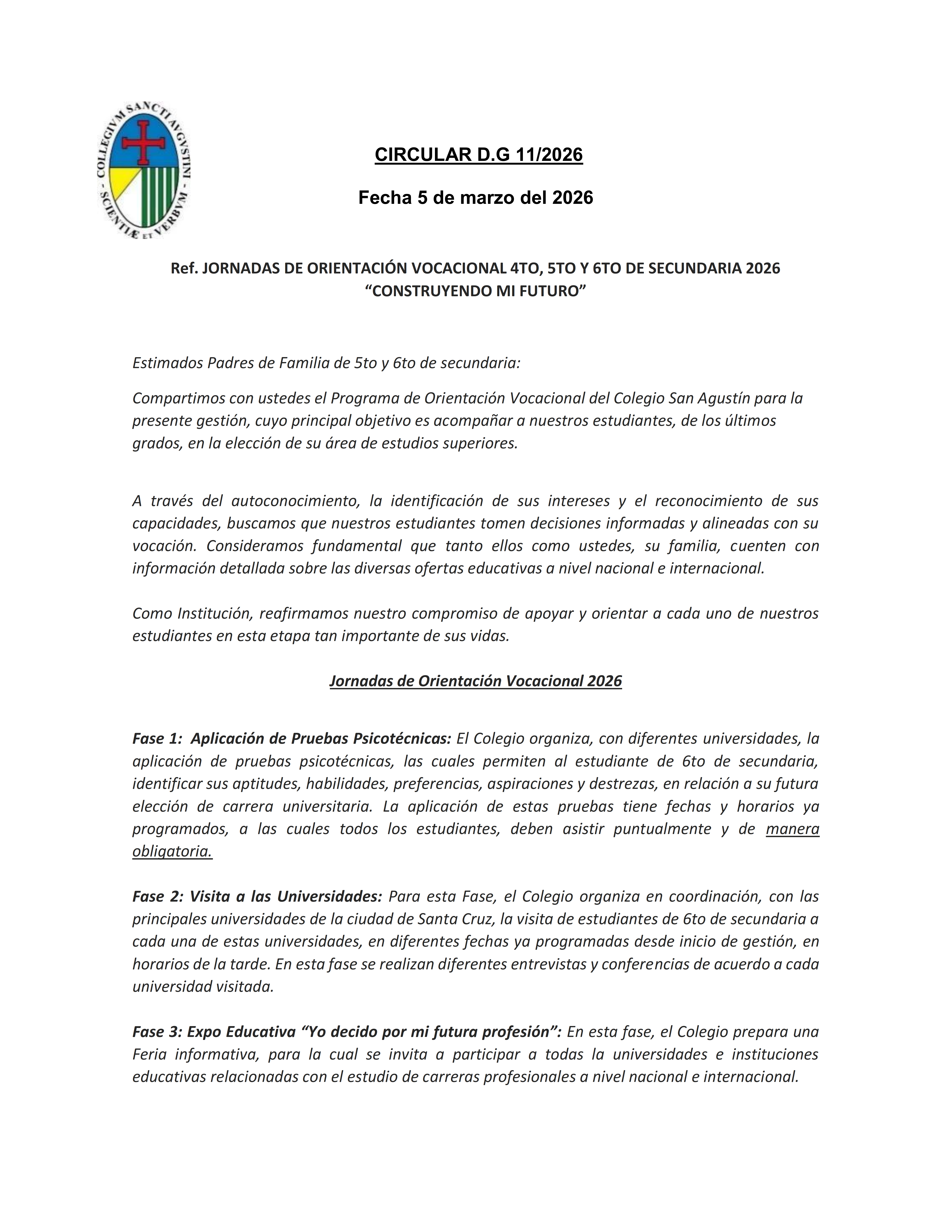 CIRCULAR D.G. 11/2026 Ref. JORNADAS DE ORIENTACIÓN VOCACIONAL 4TO, 5TO Y 6TO DE SECUNDARIA 2026“CONSTRUYENDO MI FUTURO” Mar 12, 2026 by admincsaCategories: Uncategorized CIRCULAR D.G. 11/2026 Ref. JORNADAS DE ORIENTACIÓN VOCACIONAL 4TO, 5TO Y 6TO DE SECUNDARIA 2026“CONSTRUYENDO MI FUTURO” Share: Previous Article CIRCULAR D.G. 10/2026 Ref. Campaña de Vacunación contra el Sarampión Next Article CIRCULAR D.G. 12/2026 Ref. Día de la familia: “Celebramos y recordamos a papá”