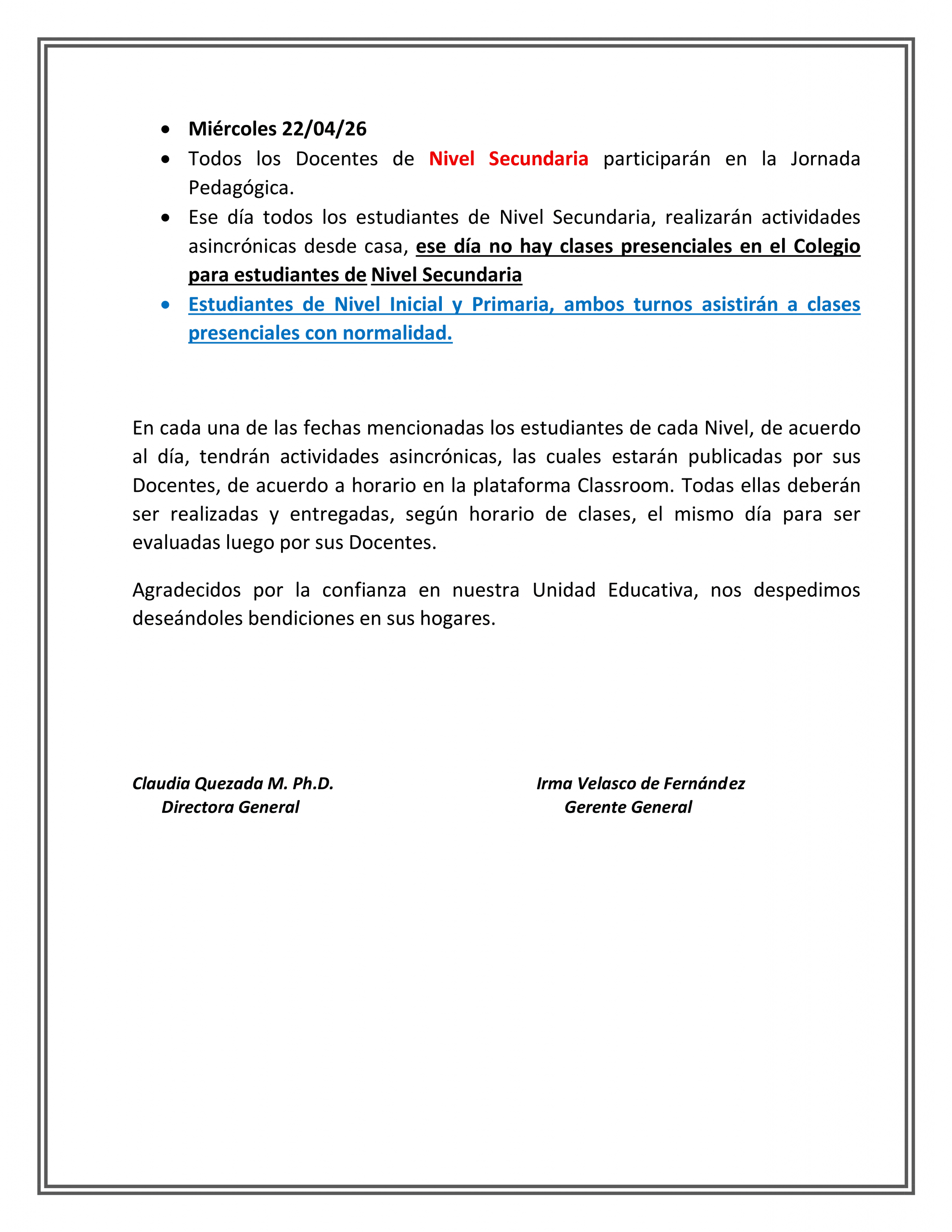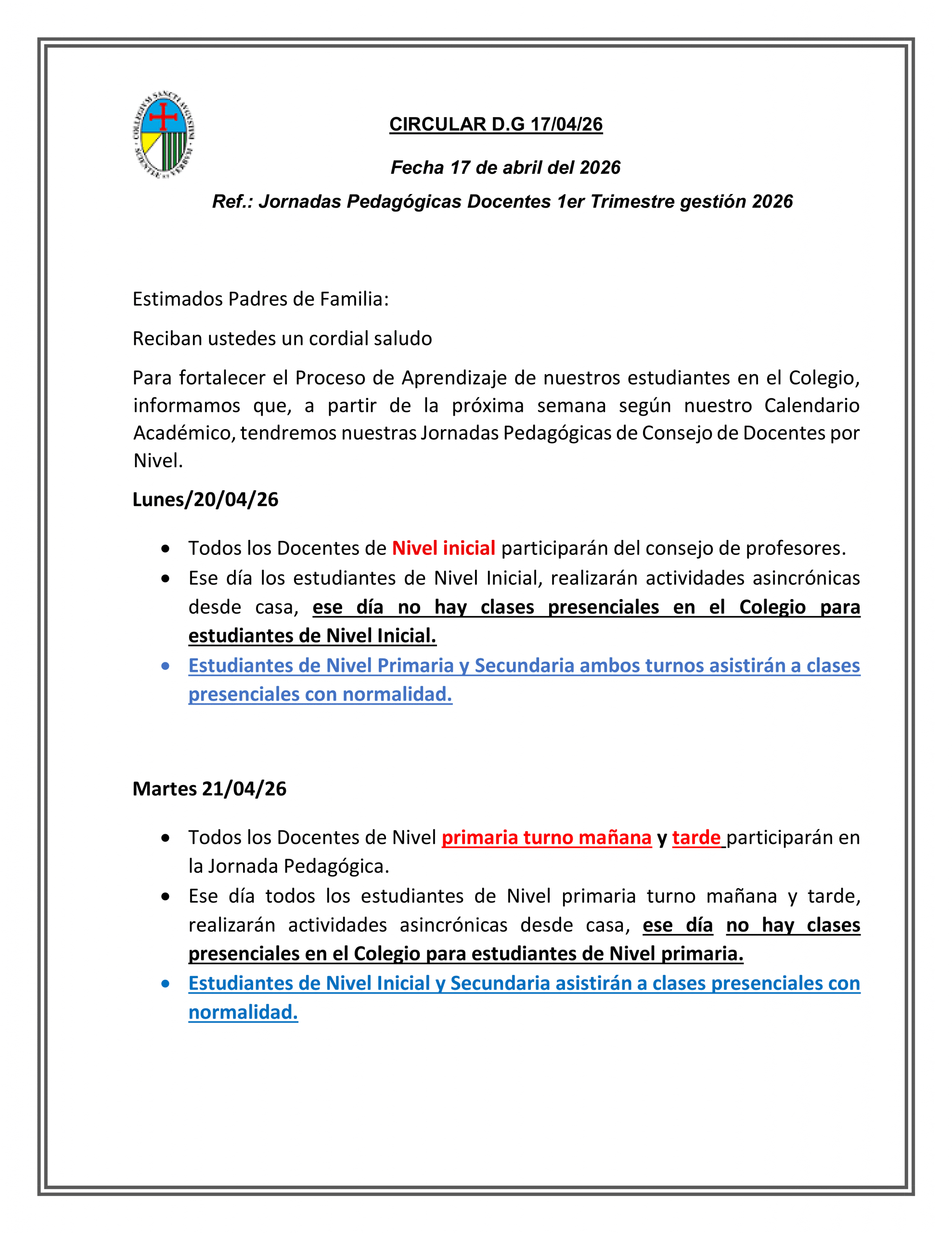 CIRCULAR D.G 17/04/26 Ref.: Jornadas Pedagógicas Docentes 1er Trimestre gestión 2026 Abr 18, 2026 by admincsaCategories: Uncategorized CIRCULAR D.G 17/04/26 Ref.: Jornadas Pedagógicas Docentes 1er Trimestre gestión 2026 Share: Previous Article CIRCULAR DG 16/2026 Ref. FESTIVAL DE POESÍA 2026 “RAUL OTERO REICHE”