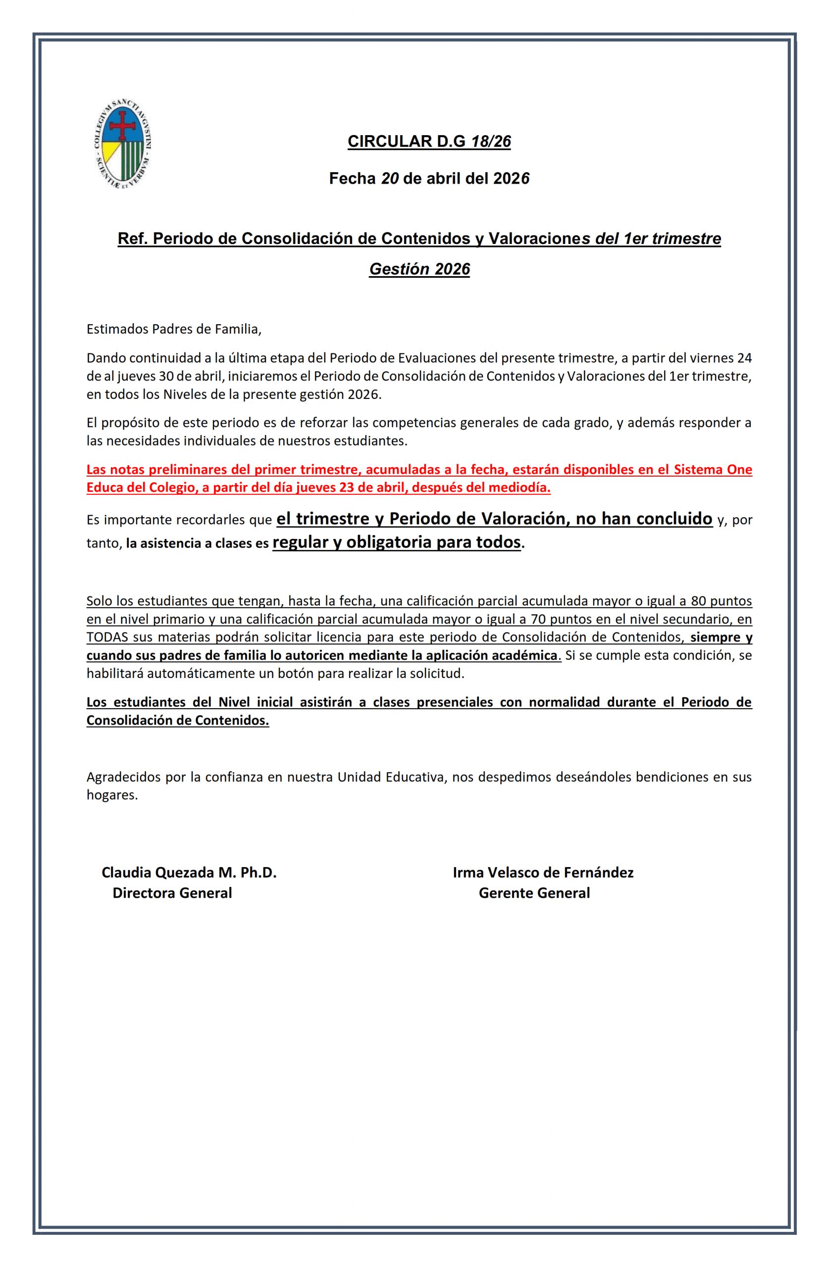 CIRCULAR D.G 18/26 Ref. Periodo de Consolidación de Contenidos y Valoraciones del 1er trimestre Gestión 2026 Abr 21, 2026 by admincsaCategories: Circulares Administración Gestión 2026 CIRCULAR D.G 18/26 Ref. Periodo de Consolidación de Contenidos y Valoraciones del 1er trimestre Gestión 2026 Share: Previous Article CIRCULAR ADM 01/2026 Ref.: Periodo de consolidación de contenidos y valoraciones del Primer Trimestre Gestión 2026