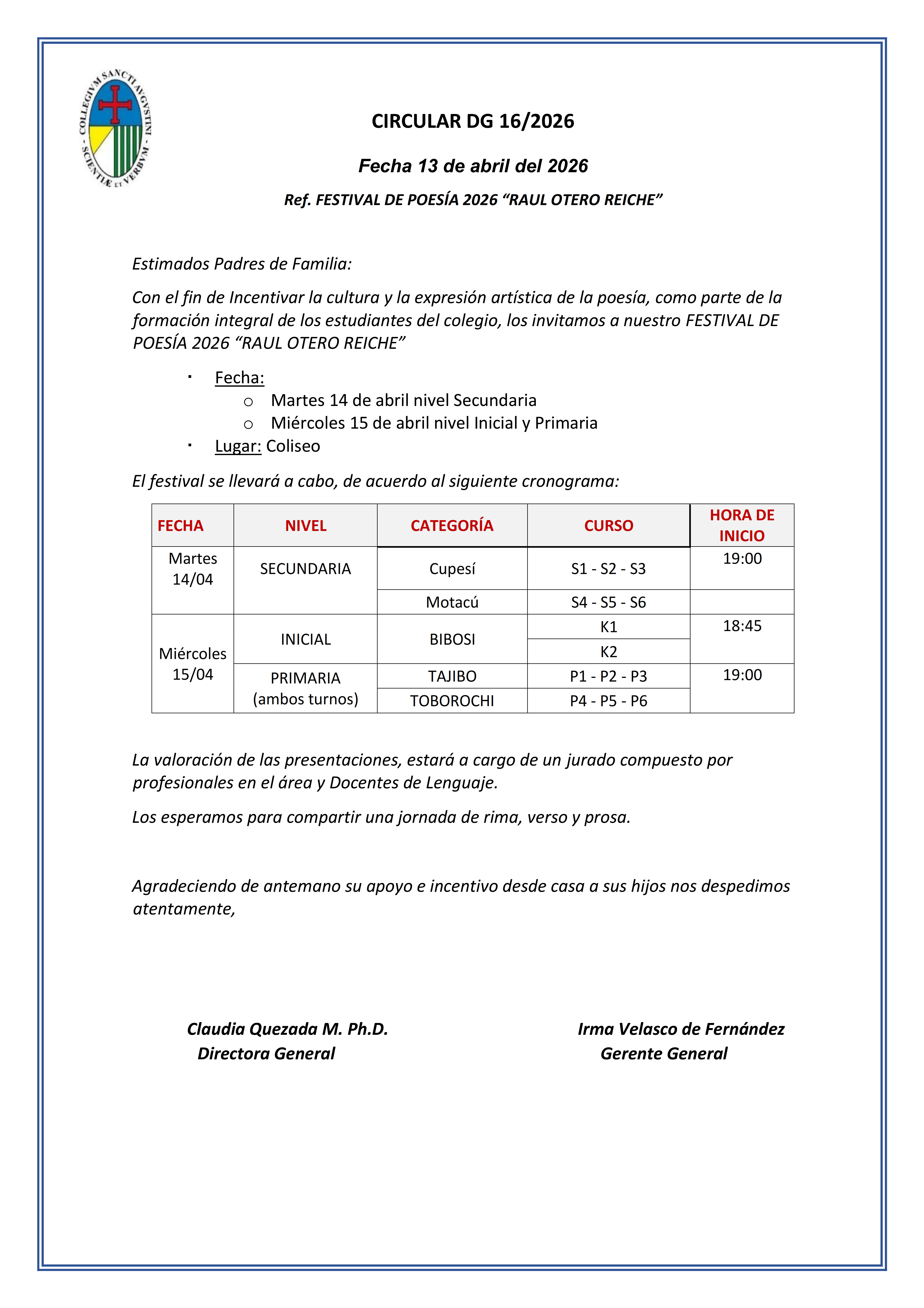 CIRCULAR DG 16/2026 Ref. FESTIVAL DE POESÍA 2026 “RAUL OTERO REICHE” Abr 14, 2026 by admincsaCategories: Uncategorized CIRCULAR DG 16/2026 Ref. FESTIVAL DE POESÍA 2026 “RAUL OTERO REICHE” Share: Previous Article CIRCULAR D.G 15/2026 Ref. Inauguración del año Deportivo